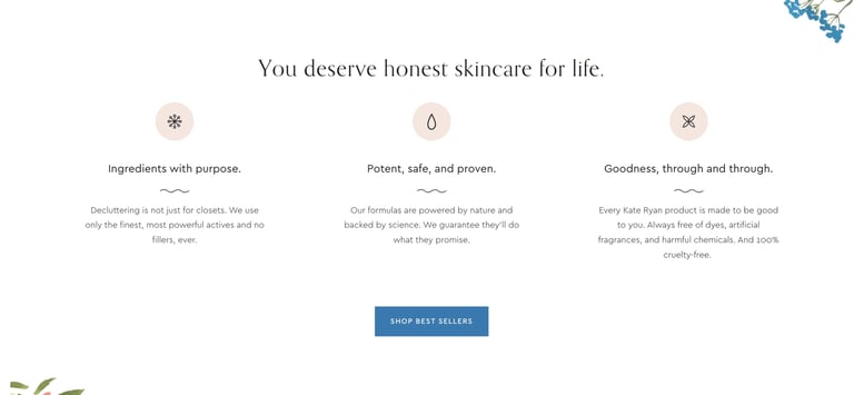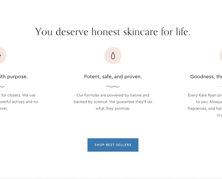 The small batch, natural skincare line Kate Ryan needed a refresh, both for their messaging and their visual identity. Working in tandem with e-commerce design studio Aeolidia, I honed in on a voice that is warm and inviting, all while letting their expertise and quality shine through. Transparency in their ingredients and science-backed formulas were key for this brand rooted in a mission to provide honest skincare for life.